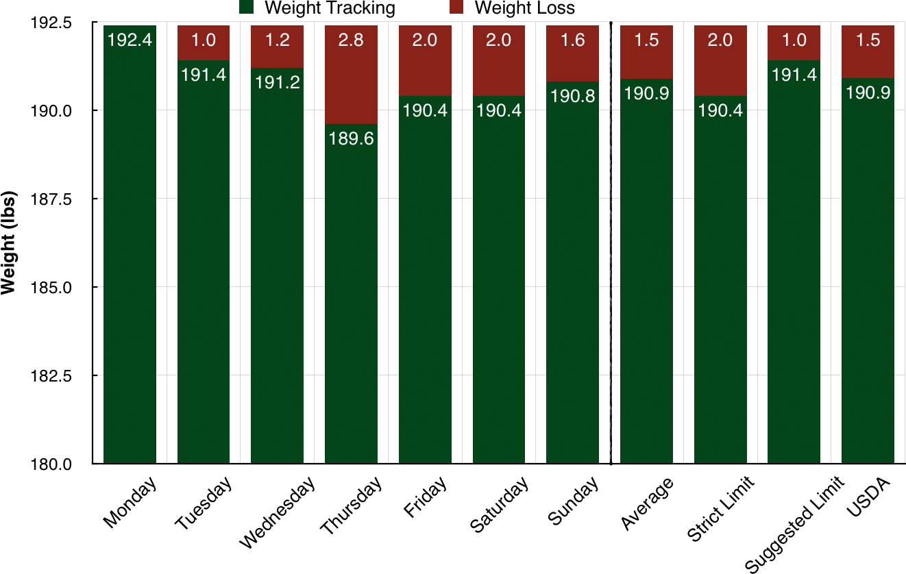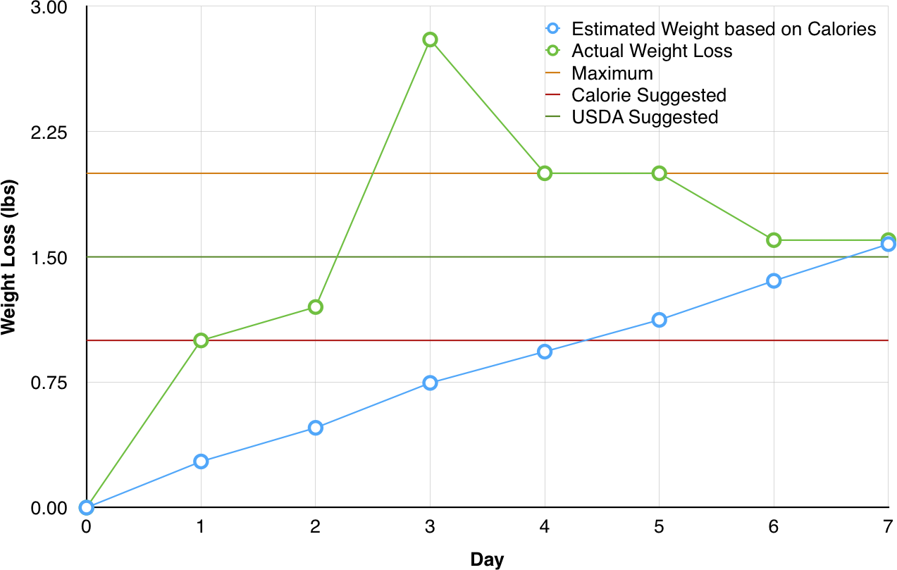 The diagram is presented in the same way as those before. The first part shows the week day-by-day and the second part shows the average weight loss, the estimation of the weight-loss based on the strict limit and the suggested limit. The last bar shows the reduction from the USDA if I follow the suggested limit. Although in the graph it shows that Thursday was the highest weight loss, you need to understand that the daily weight fluctuates significantly based on the exercise, the hydration level and the pooping cycle. What is however interesting is the direct comparison of the reduction in the calorie intake with the associated weight loss.